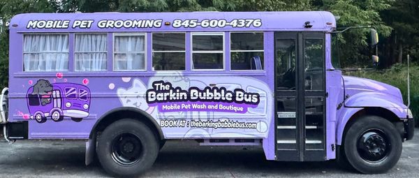 The Barkin Bubble Bus is a fully renovated, mobile dog grooming paradise! With a full stainless-steel washtub, high velocity dryers, instant water heaters, heat and air conditioning and much more, this is the ultimate pampering experience for your pups!